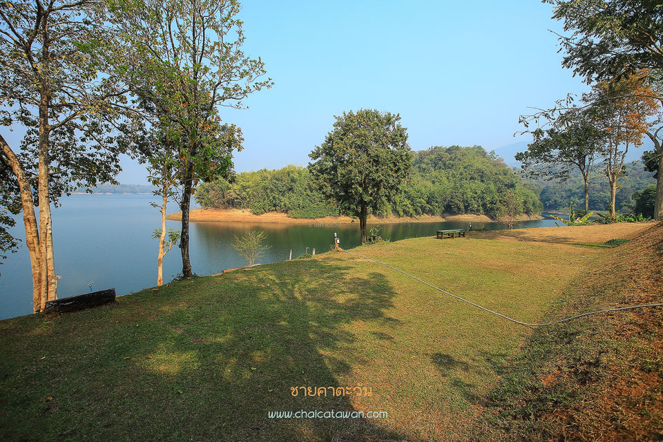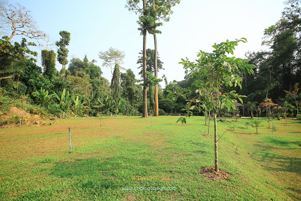 ลานกางเต็นท์หญ้าเขียว พื้นเรียบ น่ากาง อยู่ใกล้น้ำตก นอนฟังเสียงน้ำทั้งคืนเลย